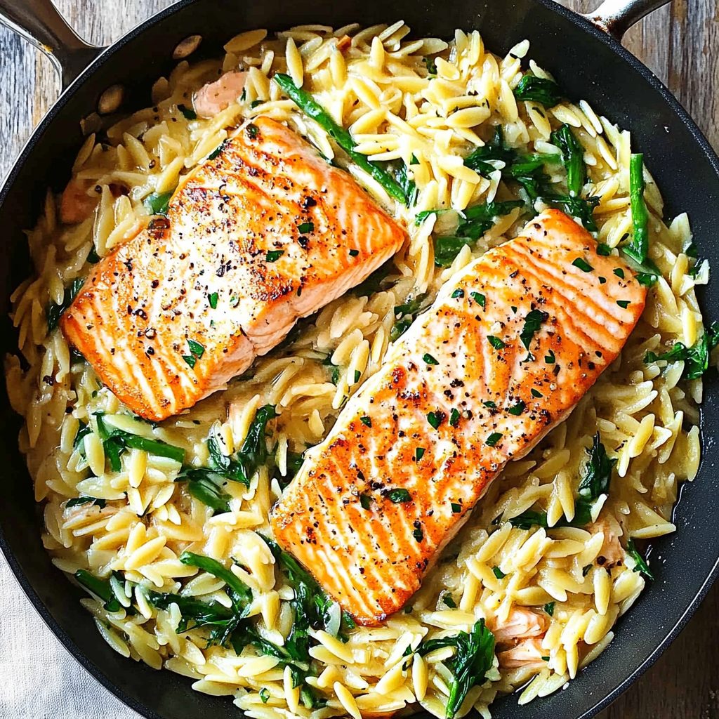 Heat olive oil and unsalted butter over medium-high heat in a large nonstick pan or skillet. Once hot, carefully add the seasoned salmon fillets to the pan. Sear them for about 3–4 minutes on each side until they are golden brown and cooked through. Removing them from the skillet at this stage helps prevent overcooking while you prepare the orzo.